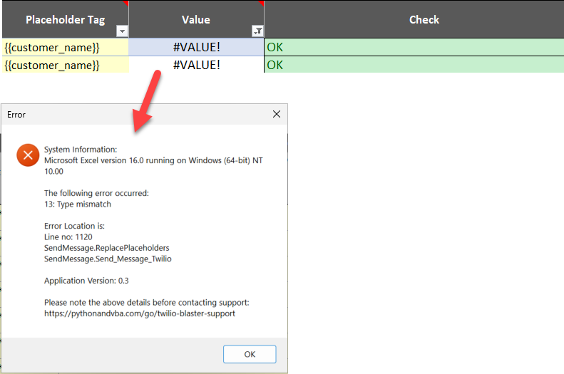 If a placeholder value has a formula error (like #VALUE!), the app shows a "Type mismatch" error and stops working.